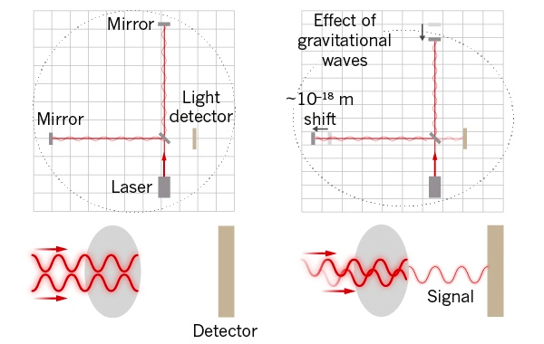 Намного более перспективными казались детекторы, в которых используется не один резонирующий объект, а отслеживается расстояние между двумя не связанными друг с другом, независимо подвешенными телами, например двумя зеркалами. Из-за колебания пространства, вызванного гравитационной волной, расстояние между зеркалами будет то чуть больше, то чуть меньше. Эти колебания сможет почувствовать лазерный луч, бегающий между зеркалами. Такая схема способна регистрировать колебания в широком диапазоне частот, от 10 герц до 10 килогерц, и это именно тот интервал, в котором будут излучать сливающиеся пары нейтронных звезд или черных дыр звездных масс.