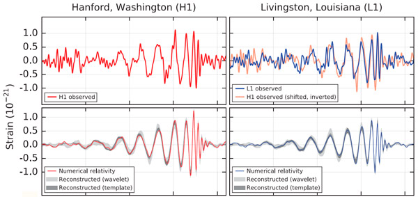 Рис. 7. Вверху: сигнал от события GW150914, зарегистрированный двумя детекторами LIGO, внизу: результат численного моделирования процесса для наиболее подходящих масс черных дыр. Изображение из обсуждаемой статьи в Physical Review Letters |