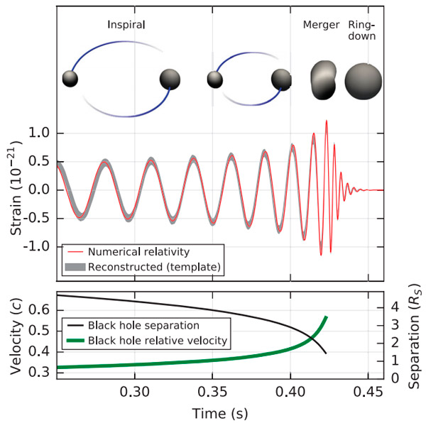 ![]() Рис. 8. Интерпретация зарегистрированного сигнала. Вверху: профиль гравитационно-волнового излучения и соответствующие ему стадии слияния двух черных дыр; внизу: изменение эффективных орбитальных параметров пары с течением времени до момента слияния. Изображение из обсуждаемой статьи в Physical Review Letters |