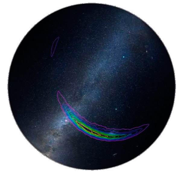Временная задержка между двумя детекторами составила примерно 7 миллисекунд. Это позволило оценить направление прихода сигнала (рис. 9). Поскольку детекторов только два, локализация вышла очень приблизительной: подходящая по параметрам область небесной сферы составляет 600 квадратных градусов.