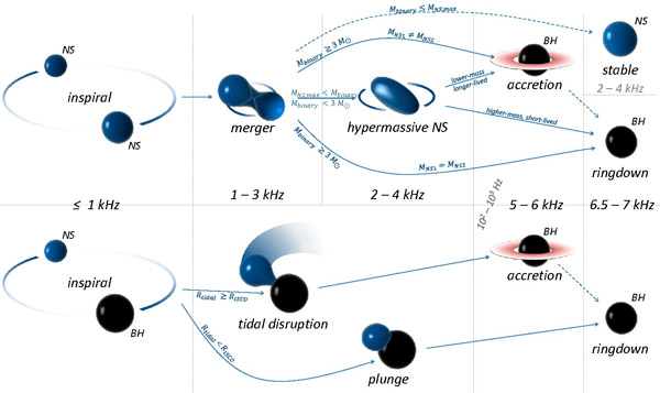 Рис. 10. Возможные сценарии слияния нейтронной звезды с другой нейтронной звездой или с черной дырой. Информацию о развитии событий в каждом сценарии можно будет извлечь с помощью гравитационно-волнового всплеска. Изображение из статьи Imre Bartos, Patrick Brady, Szabolcs Marka, 2012. How Gravitational-wave Observations Can Shape the Gamma-ray Burst Paradigm |