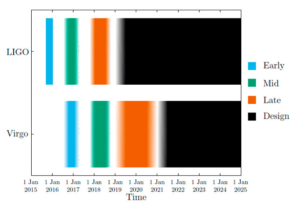 ![]() Рис. 11. Этапы введения в строй обновленных детекторов LIGO и Virgo. Изображение с сайта relativity.livingreviews.org |